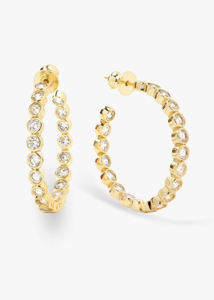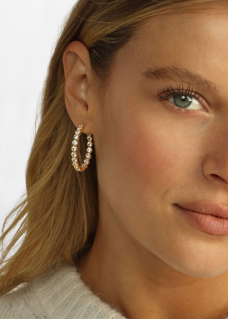 Meet your new go-to: The Baroness Hoops. With 40 bezel-set simulated diamonds, these 1.25” stunners catch the light from every angle—bringing the perfect blend of elegance and everyday wearability. Whether it’s coffee runs or cocktail hour, they’re always the right choice.