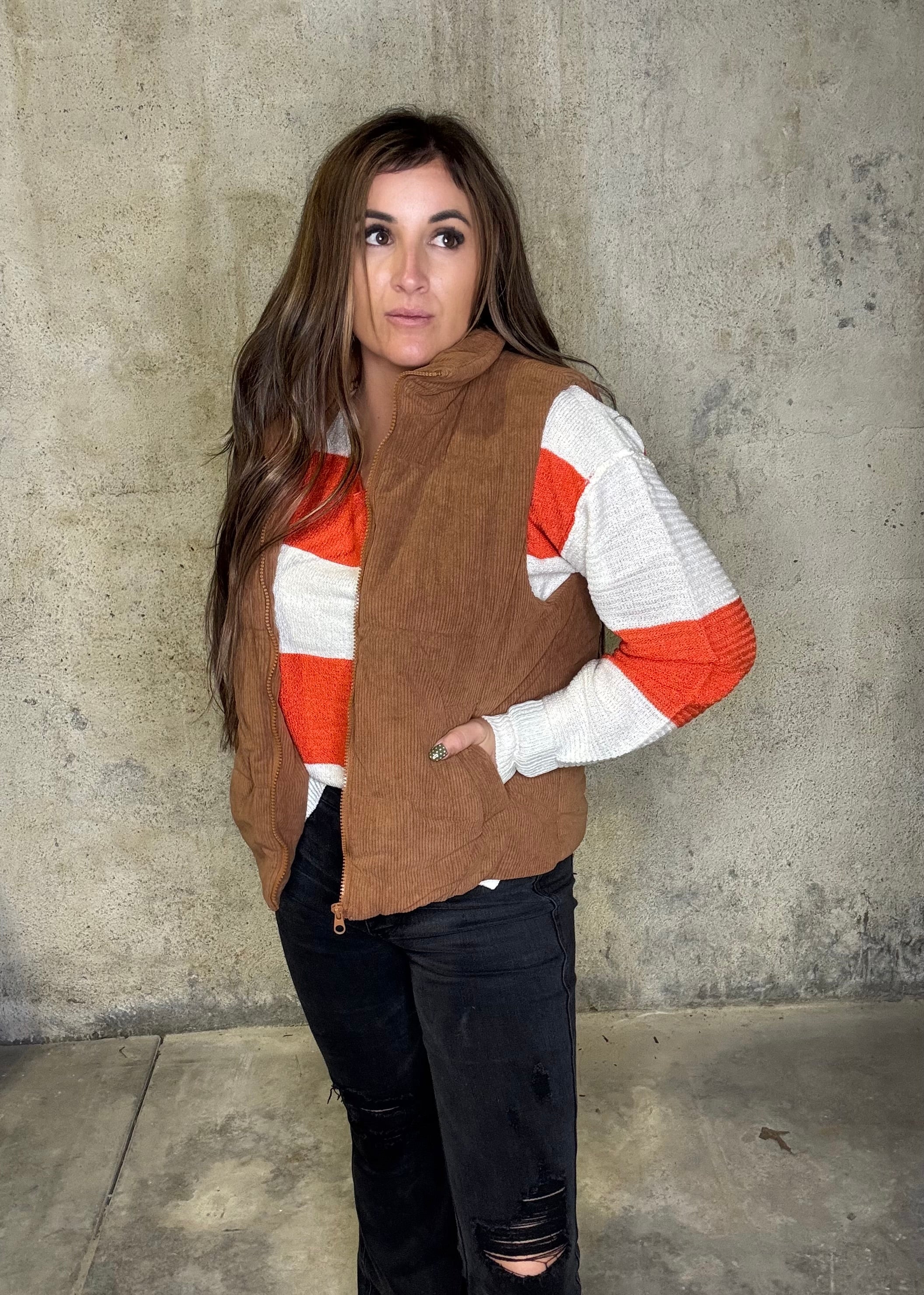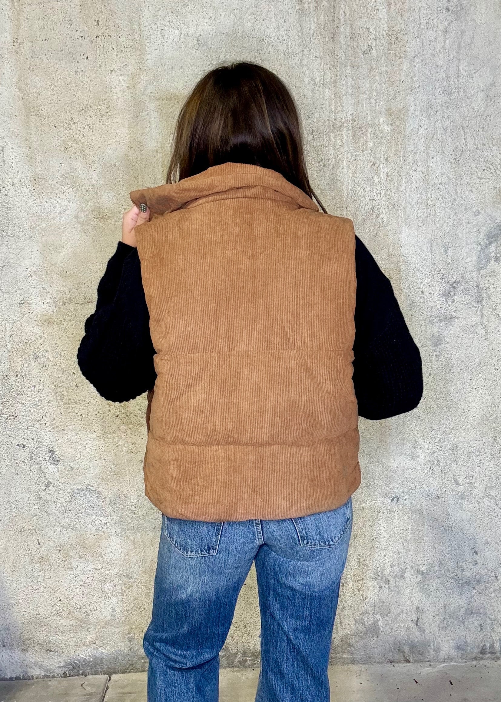 Layer up in style with this warm and versatile corduroy vest in a rich camel brown. Featuring a zip-front closure, side pockets, and a relaxed fit, it’s the perfect piece to throw over sweaters, flannels, or long sleeves for that effortless fall look. True to size—Lyndsey is wearing a Small.
